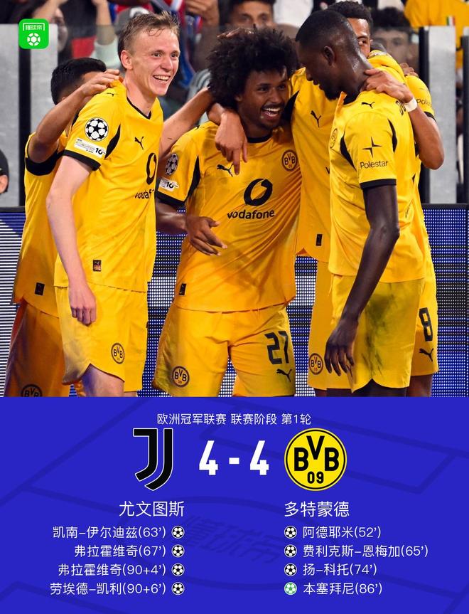 北京时间9月17日,尤文图斯在欧冠联赛阶段第1轮主场迎战多特蒙德。上半场双方均未能有所建树,但下半场比赛进入高潮。阿德耶米贴地斩破门为多特蒙德首开记录,随后双方在4分钟内由凯南-伊尔迪兹、费利克斯-恩梅加和弗拉霍维奇总共打进三球使得比分变为2-2。扬-科托低射帮助多特蒙德再度领先,凯利手球送点后本塞拜尼主罚破门将比分改写为4-2。然而伤停补时再度风云突变,弗拉霍维奇和凯利接连破门使得尤文再度追平比分,最终尤文图斯和多特蒙德在一场进球大战当中4-4战平。