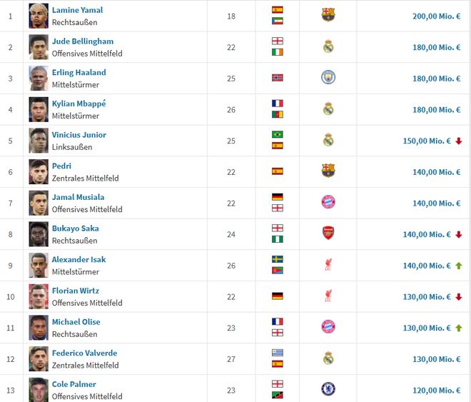 其中亚马尔2亿欧身价领衔,贝林、哈兰德、姆巴佩均1.8亿欧紧随其后。