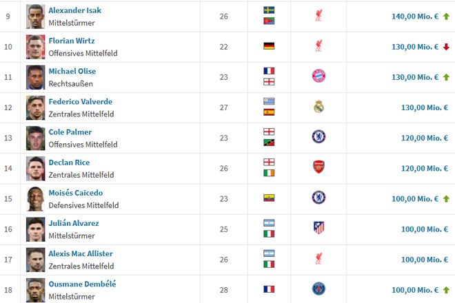 德转显示,目前五大联赛共有18名球员身价破1亿欧。